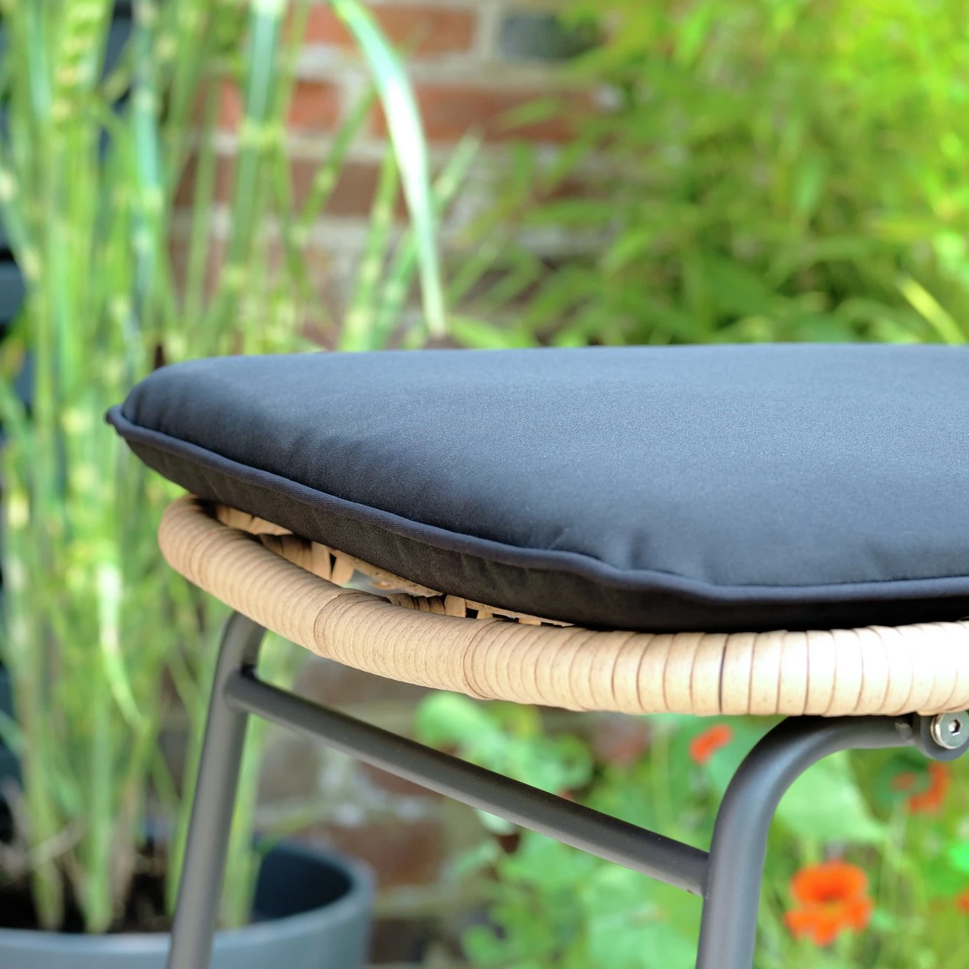 Create a bistro zone on your own patio with our chic bar set. This 3-piece combination is striking and just perfect as we enter the warmer months. Classically styled with a rattan-edged, round glass table top and typical thigh-high bar chairs it's great for brunch, lunch or evening cocktails. Comfortable, stylish and fun.