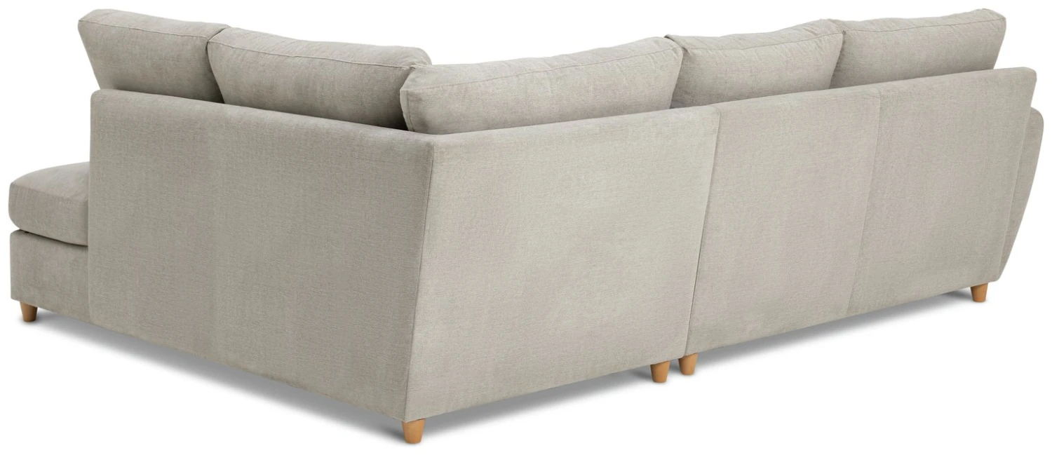 Stretch out and sink into our modern comfy chaise. With deep pocket sprung seats and an abundance of plump cushions this sofa was made for lounging. Upholstered in grey fabric with warm toned wooden feet.