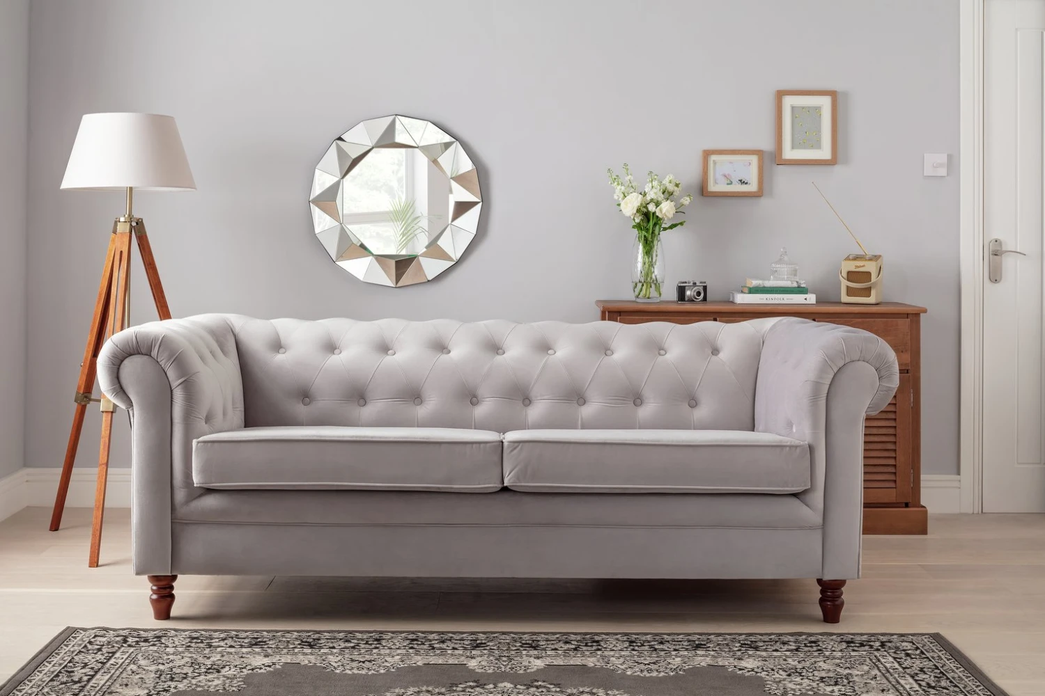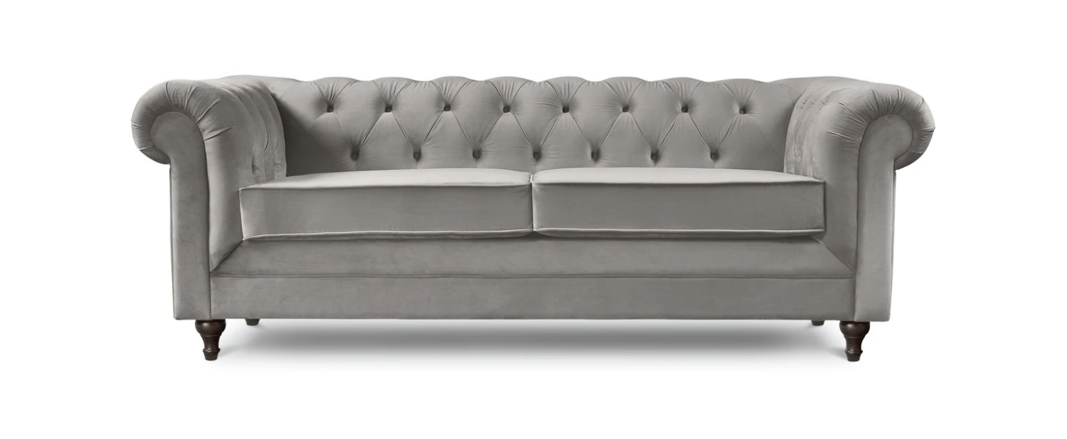 Incredibly iconic. Our Chesterfield sofa is full of character with its upholstered, low deep buttoned back and pleated scroll arm design. It brings a whole new wow factor to a room. Total accent piece in a luxurious velvet style. The split, foam-filled seat offers comfort and a perfect level of firmness to ensure this eye-catching stunner keeps its looks. Shapely, turned feet in solid wood are a final finishing flourish and lift it just off the floor to prevent any scuffing. Forever fashionable.