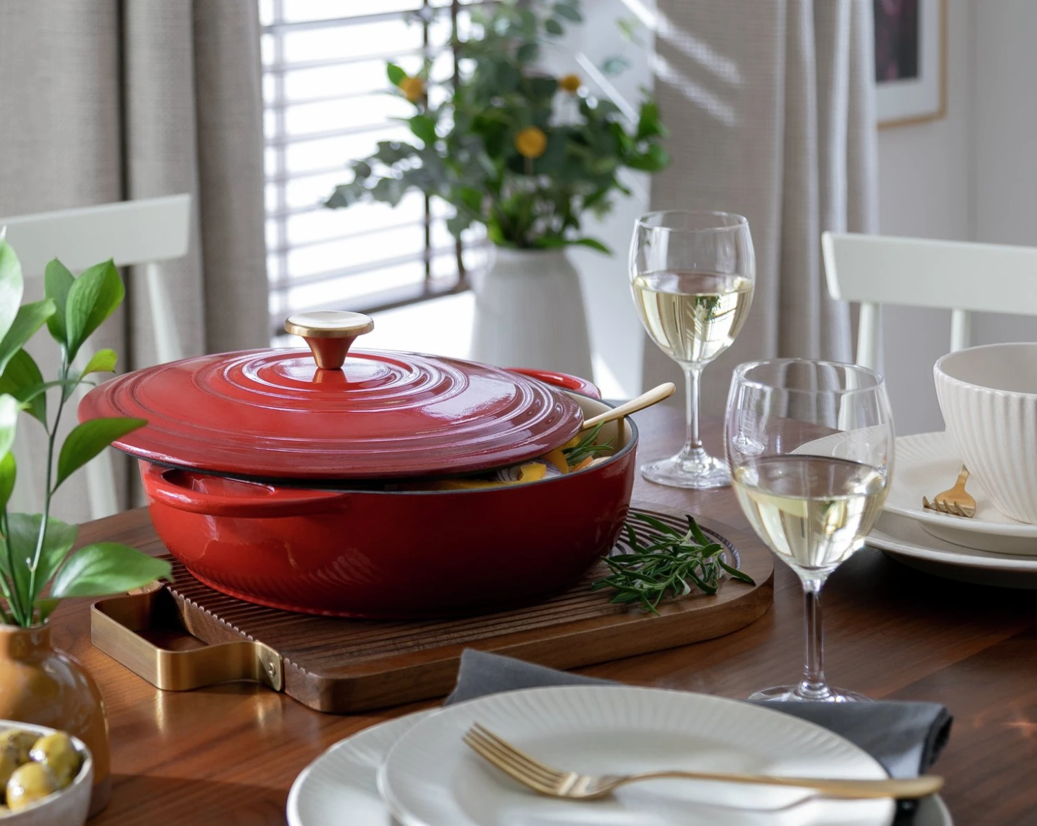 Sizzling style. Our classic cast iron casserole dish is a trusted kitchen favourite. Great for curries, stews and hearty hotpots. It spreads heat evenly and keeps your food warm until you're ready for seconds. Pop it in the oven or on the hob then take it straight to the table. Gas, electric, induction, it can handle them all. Bring a rustic touch to your kitchen with its deep red tones, gradient finish and smart bronze handle. Built to last. Feed the family for many feasts to come.