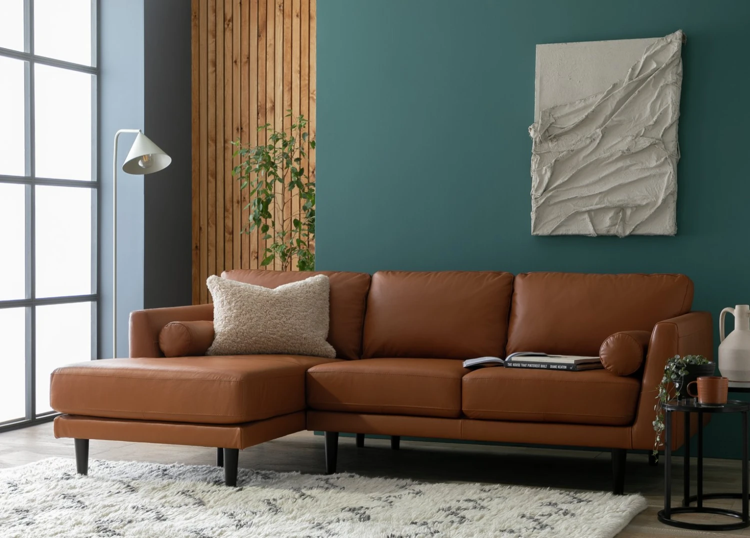 Join Jackson for some mid-century modern comfort. Upholstered in premium leather, this corner chaise sofa is invitingly indulgent. Wide and low it gives off those retro vibes. Lean on the arms and plump round bolsters, relax into the pocket sprung foam seats and fibre-filled back cushions. Now put your feet up and chill.