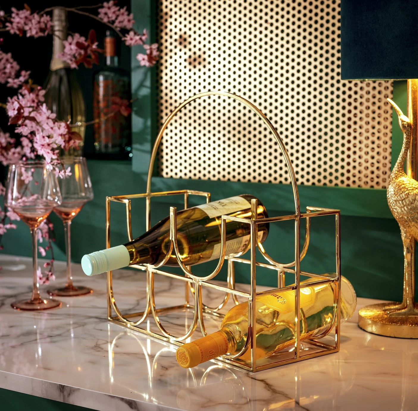 Glitz and glamour. With an elegant and structural form, our Japonica wine rack has it all and more. Crafted in gold toned stainless steel, it's sumptuous and luxurious. Designed to carefully cradle up to 5 of your favourite vintages. Sits elegantly on the sideboard too.