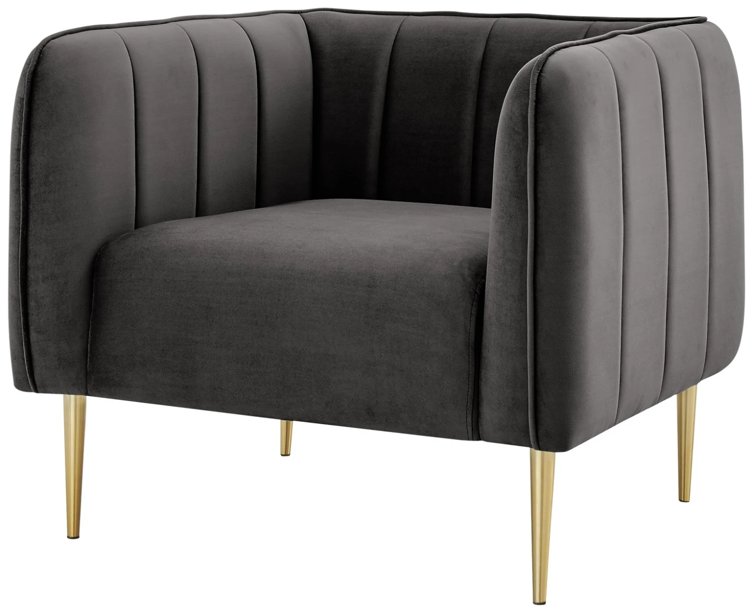 Our charcoal grey Lola chair is all about glamour. Upholstered in luxurious 100% velvet, the quilted design creates sumptuous seating. Plush and plump. Gold metal legs and piped trim enhance the elegance. Sit back and survey the room.