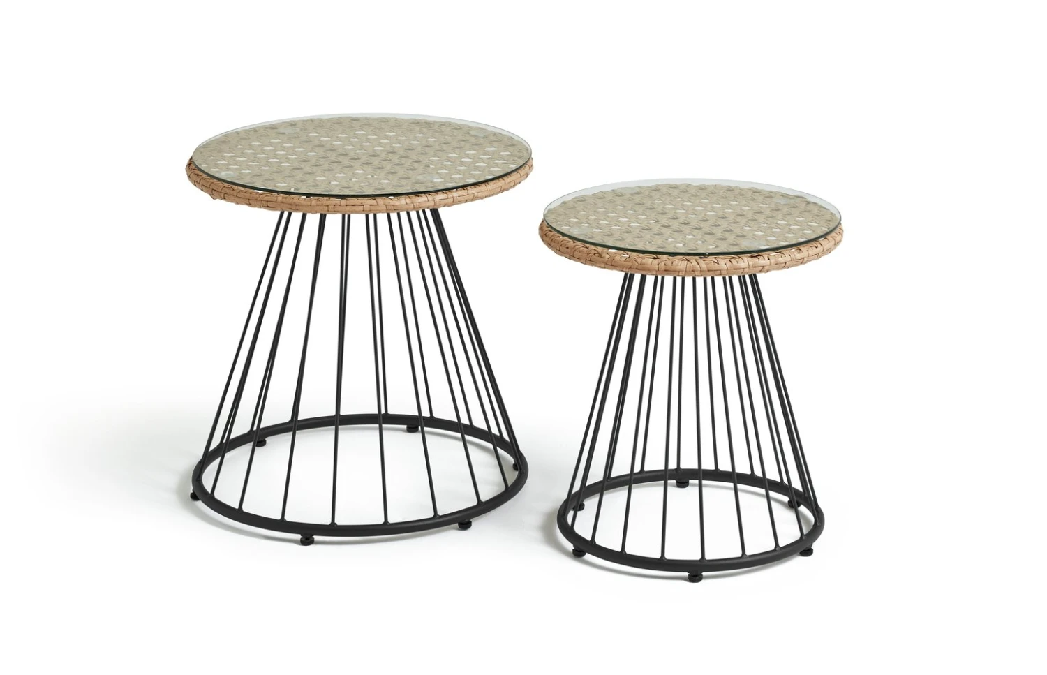 Want a pop of personality for your patio? This boho-inspired rattan garden sofa set will give you that and more. Its comfy cushioning and cocooning curves combine with elegant steel legs make these chic seats inviting and super smart. To finish the cool cafe look, 2 conical, glass topped tables make a handy resting place for your favourite tipple. The perfect antidote to a stressful day. Just add friends, fizz and a fire pit. Sunshine optional.