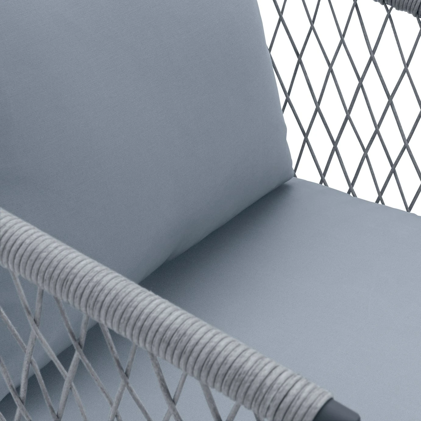 Cocktails or coffee? Take your pick and hunker down. Create a relaxing set up on your patio with this 2-seater bistro set. With a pair of comfy chairs and a matching glass top coffee table it's a great excuse for chilling out. Strong and smart. The frame is made from steel, and the grey rattan like rope is handwoven into a loose diamond weave. Comes with 4 cushions, all with removable, washable covers. Settle in and enjoy.