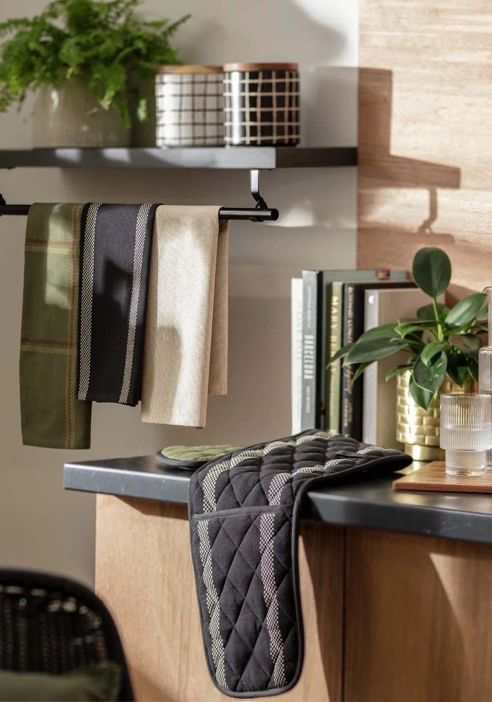 Take 3 designer woven cotton tea towels, add a matching double oven glove and what have you got? A smart 4-piece textile set that'd be welcome in any kitchen. An exclusive Habitat design, in black, cream and dark green.